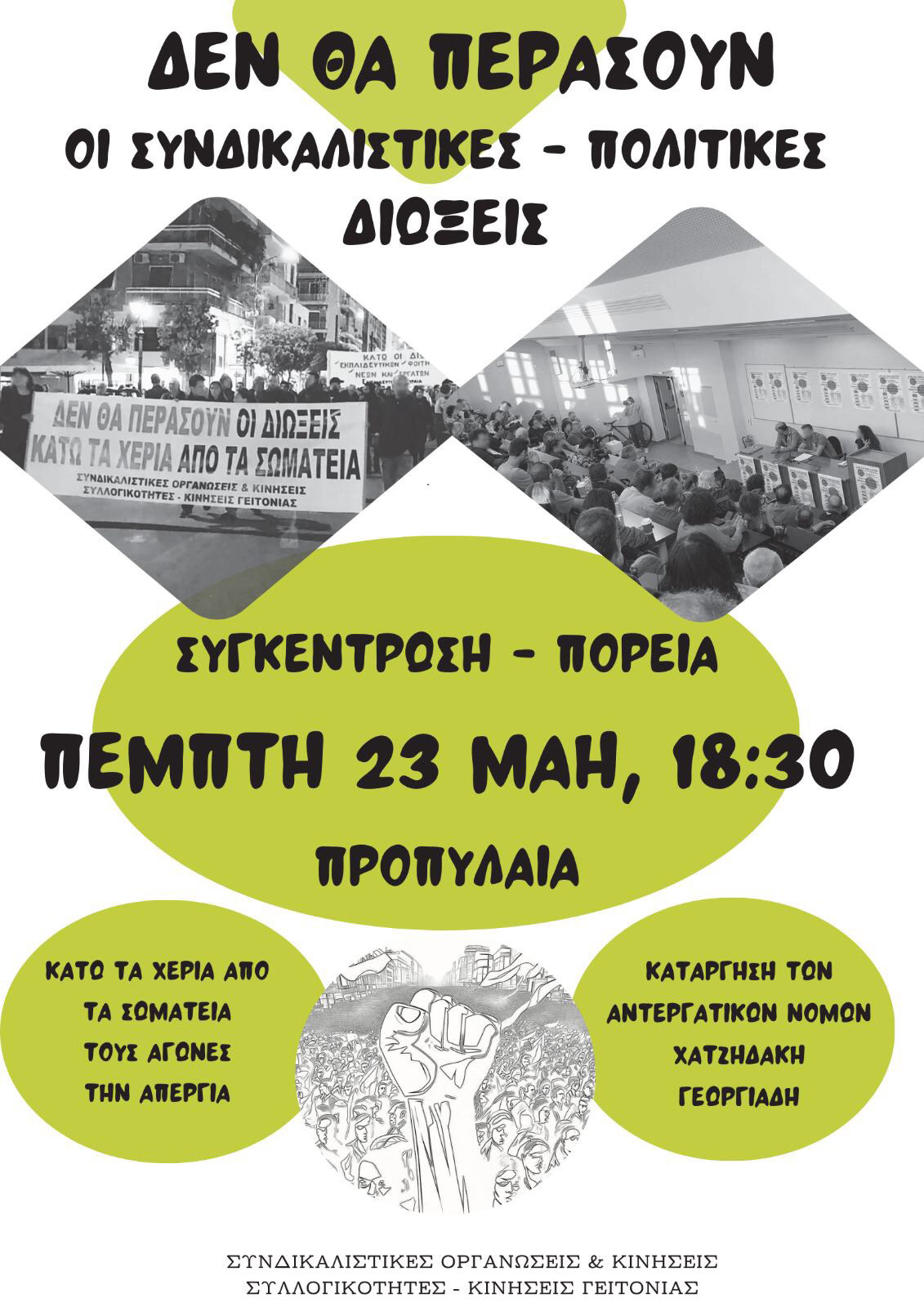 Κάλεσμα προς όλες τις οργανώσεις της εξωκοινοβουλευτικής αριστεράς σε σύσκεψη την Παρασκευή 10 Μάη, στις 6.30 μμ: Για την ανάγκη ολόψυχης και αποφασιστικής στήριξης της διαδήλωσης ενάντια στις συνδικαλιστικές –πολιτικές διώξεις που έχει προγραμματιστεί την Πέμπτη 23 Μάη, 6.30 μμ στα Προπύλαια