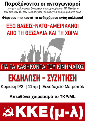 Το  ΚΚΕ(μ-λ), καλεί τους εργαζόμενους, το λαό και τη νεολαία της Λάρισας, την Κυριακή 9 Φλεβάρη στις 11πμ στο ξενοδοχείο Μετροπόλ, σε εκδήλωση-συζήτηση για τις εξελίξεις στη ΝΑ Μεσόγειο και τα καθήκοντα του εργατικού, λαϊκού και νεολαιίστικου κινήματος απέναντι στον ιμπεριαλισμό και το ντόπιο κεφάλαιο, την εξάρτηση, τους άδικους πολέμους, και τον εθνικισμό.