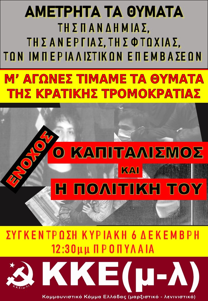 Στις 6 του Δεκέμβρη τιμούμε όλους τους νεκρούς μας. Τα θύματα της πανδημίας και των πολέμων. Για μας δεν είναι αριθμοί. Τους τιμούμε όπως τους πρέπει. Με αγώνα και διαδήλωση. Δεν ξεχνούμε τα ζωντανά θύματα των πολιτικών τους, τους άνεργους και τους φτωχούς. Στις 6 του Δεκέμβρη διαδηλώνουμε όπως διαδηλώσαμε στις 17 του Νοέμβρη και τιμήσαμε το Πολυτεχνείο, όπως διαδηλώσαμε στην απεργία στις 26 του Νοέμβρη και καταγγείλαμε τους νόμους και την πολιτική τους.