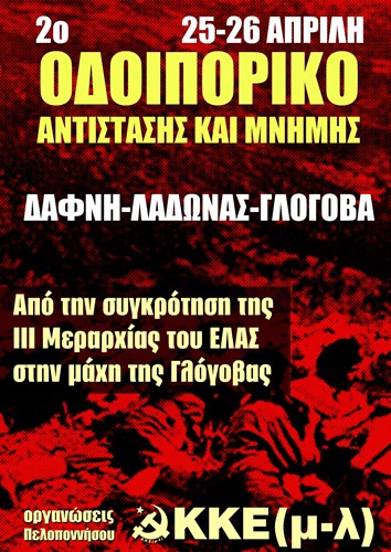 Με αφορμή την ιστορική μάχη της Γλόγοβας (Απρίλης 1944) με έκβαση την συντριβή των Ναζί από τις δυνάμεις του ΕΛΑΣ και την πρώτη παμπελοποννησιακή συνέλευση του ΕΑΜ για την συγκρότηση του ΕΛΑΣ Πελοποννήσου σε Μεραρχία (Δάφνη Νοέμβρης 1943) οι οργανώσεις Πελοποννήσου πραγματοποιούν το 2ο Οδοιπορικό Αντίστασης και Μνήμης στον ποταμό Λάδωνα στις 25 και 26 Απρίλη.
