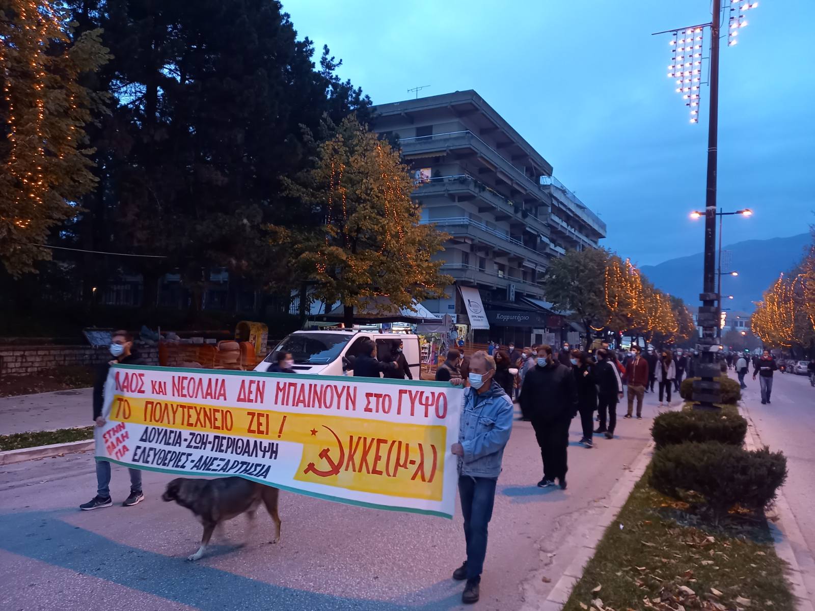 Με βάση την εκτίμηση ότι δεν μπορούσε να γίνει συγκέντρωση στο χώρο της Δόμπολης, η τελευταία συνεννόηση των οργανώσεων που έβγαλαν κοινό κάλεσμα αποφάσισε να αλλάξει ο χώρος συγκέντρωσης και να συγκεντρωθούν στο κέντρο της πόλης, όπου και πραγματοποίησαν διαδήλωση. Όλα τα υγειονομικά μέτρα ήταν συλλογική μέριμνα, έτσι όπως ξέρει ο λαός να προστατεύεται. Η πορεία αντιμετώπισε τα ΜΑΤ που της έφραξαν το δρόμο, αλλά το σημαντικό είναι ότι παρά την τρομοκρατία η απαγόρευση έσπασε στην πράξη. Μέσω ελιγμών των μπλοκ (ΚΚΕ(μ-λ), ΑΝΤΑΡΣΥΑ, ΕΠΙΤΡΟΠΗ ΟΡΓΑΝΩΣΕΩΝ ΕΡΓΑΤΙΚΩΝ-ΦΟΙΤΗΤΙΚΩΝ ΣΥΛΛΟΓΙΚΟΤΗΤΩΝ, ΜΛ ΚΚΕ) μέχρι να σφίξει ο κλοιός έγινε μικρή διαδήλωση, η οποία έληξε σε χρόνο τέτοιο ώστε να καταφέρει ένα δυναμικό να μπορέσει να διαφύγει απ΄ τον κλοιό με «ασφάλεια». Στη διαδήλωση συμμετείχαν περίπου 200 άτομα.