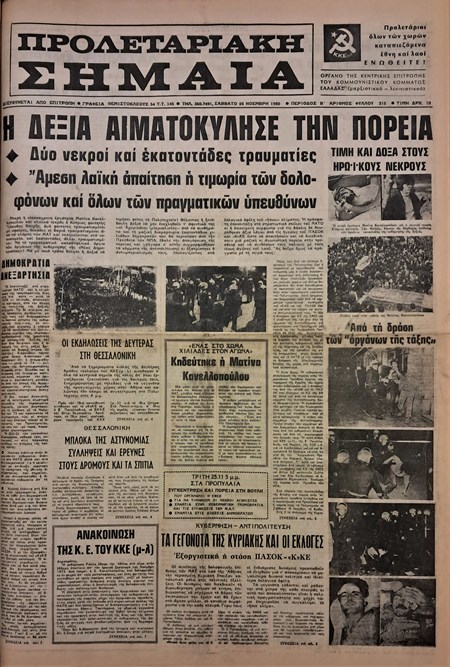 Δεύτερη περίοδος, φύλλο 215, 22 Νοέμβρη 1980. Το πρωτοσέλιδο περιλαμβάνει αποκλειστικά τα γεγονότα της πορείας του Πολυτεχνείου που ματοκύλισε η κυβέρνηση της ΝΔ με τραγικό απολογισμό δυο νεκρούς και εκατοντάδες τραυματίες.