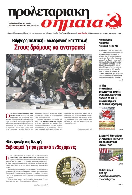 Φύλλο 664, 14 Μάη 2011. Η μαζική απεργία στις 11 Μάη ενάντια στο δεύτερο μεσοπρόθεσμο χτυπήθηκε με λύσσα και απρόκλητα από την αστυνομία. Η διάλυση των δικαιωμάτων λαού και νεολαίας και η κλοπή του πλούτου που παράγουν, όπως την υλοποιούσε η πολιτική των μνημονίων, περνούσε με τη βία των δυνάμεων καταστολής και με κάθε κόστος, κάτω από τις εντολές των ιμπεριαλιστών-δανειστών.