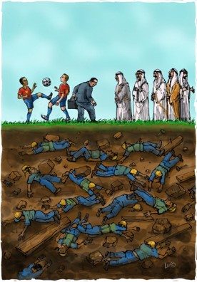Όταν ήρθε λοιπόν η ώρα να χτιστούν τα γήπεδα που θα φιλοξενούσαν τους αγώνες, είδαμε για ακόμα μια φορά το πραγματικά σκληρό πρόσωπο του συστήματος. Χιλιάδες εργατών αναγκάστηκαν να εργάζονται 12ωρα ημερησίως κάτω από άθλιες συνθήκες για 200 ευρώ το μήνα. Οι εργάτες δούλευαν χωρίς κανένα εργασιακό δικαίωμα, χωρίς δικαίωμα σε απεργία και διαμαρτυρία και χωρίς δικαίωμα να γυρίσουν πίσω στην πατρίδα τους αν δεν εξασφαλίσουν πρώτα άδεια από τον εργοδότη, που σε πολλές περιπτώσεις σημειώνεται ότι τους έπαιρναν διαβατήρια και ταξιδιωτικά έγγραφα.