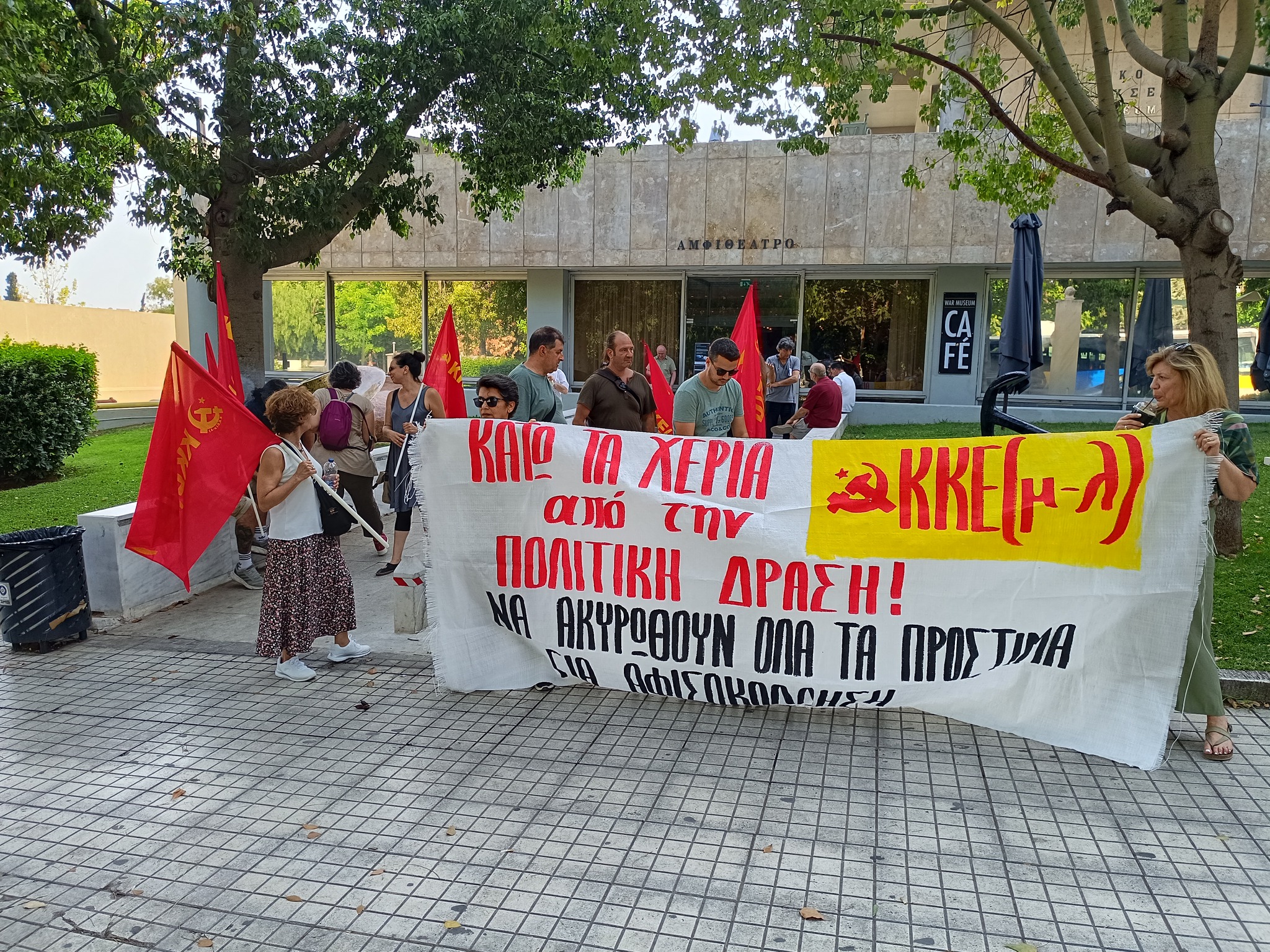 Μετά την παρέμβαση έξω από το δημαρχείο στις 27 Ιουνίου την ώρα που πραγματοποιούνταν το δημοτικό συμβούλιο Αθήνας, σειρά είχε η παρέμβαση έξω από το συμβούλιο της περιφέρειας Αττικής στο αμφιθέατρο του Πολεμικού Μουσείου. Υπενθυμίζουμε πως και ο δήμος και η περιφέρεια έχουν χρεώσει με πρόστιμα για προεκλογικά υλικά όχι μόνο το ΚΚΕ(μ-λ) αλλά και άλλες οργανώσεις και κόμματα. Αν το δημοτικό συμβούλιο γίνεται κεκλεισμένων των θυρών -άλλο ένα στοιχείο της βαθιά αντιδημοκρατικής τροπής που έχουν πάρει όλες αυτές οι διαδικασίες-, το περιφερειακό γίνεται, ακόμα, χωρίς περιορισμούς στην παρακολούθηση.