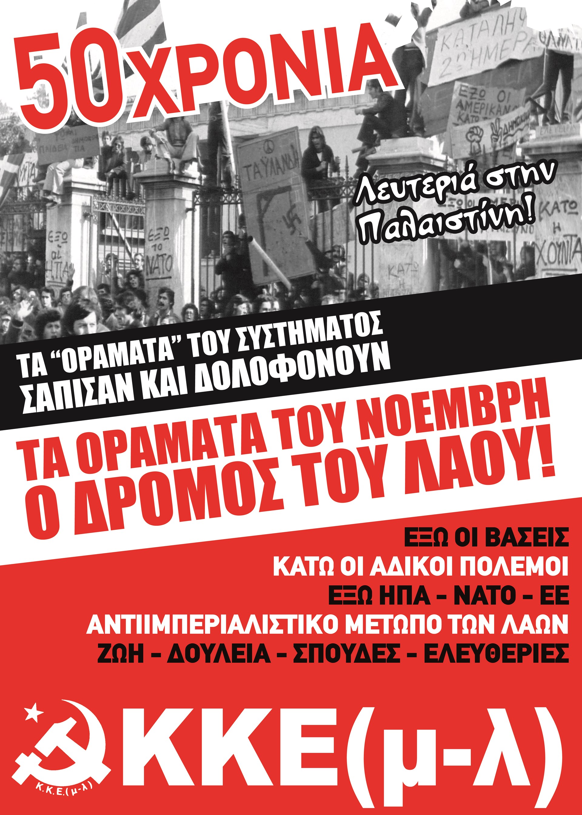 Σε αυτές τις συνθήκες που το σύστημα της εξάρτησης και της εκμετάλλευσης αποκαλύπτει τη χρεοκοπία του, τα αντιδραστικά χαρακτηριστικά του, η εξέγερση του Νοέμβρη δείχνει το δρόμο λαού και νεολαίας! Πραγματική απειλή για το σύστημα, πραγματική διέξοδος για το λαό, είναι τα οράματα της. Να την τιμήσουμε όπως της αξίζει! Παλεύοντας για να συγκροτηθεί λαός και νεολαία σε δύναμη αντίστασης και διεκδίκησης, στην προοπτική της αναμέτρησης για ανεξαρτησία και σοσιαλισμό!