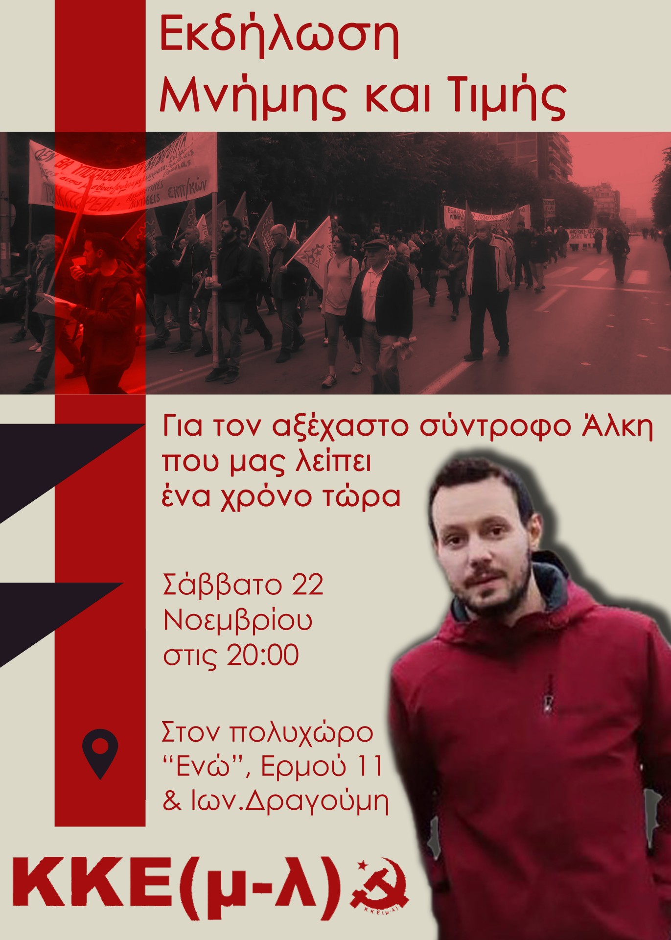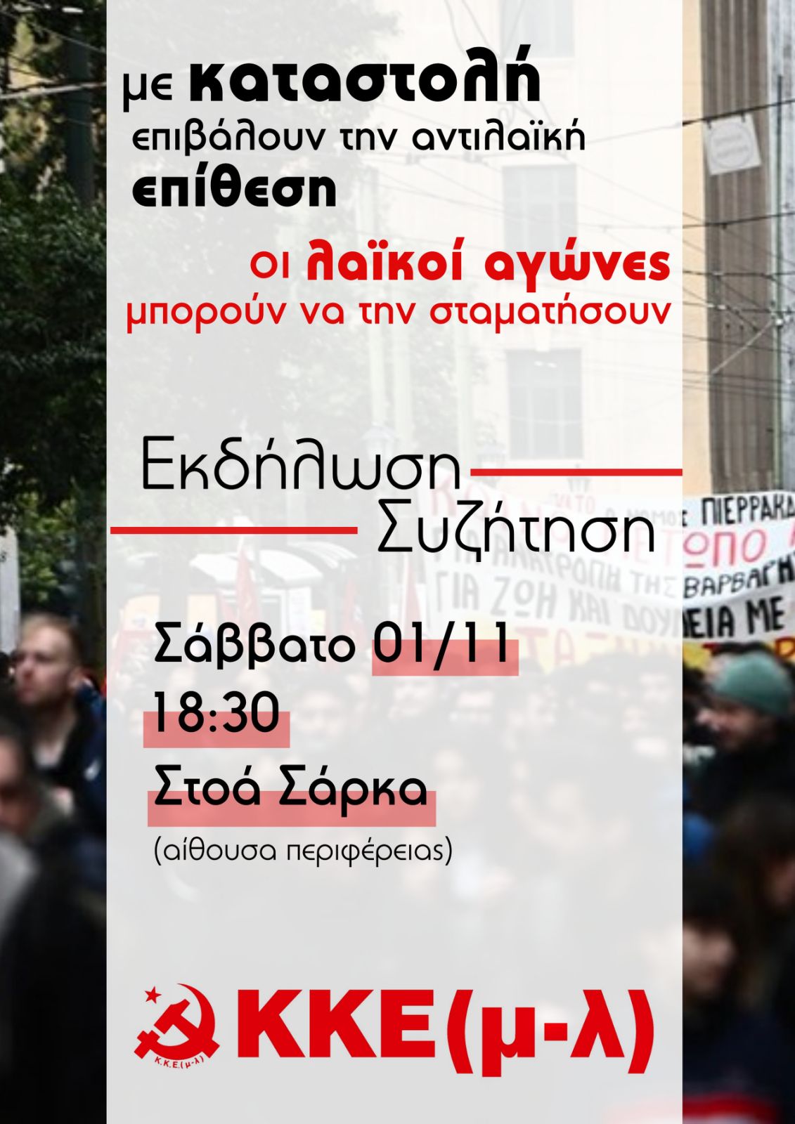 Το ΚΚΕ(μ-λ) διοργανώνει εκδήλωση με τίτλο "Με καταστολή επιβάλουν την αντιλαϊκή επίθεση - Οι λαϊκοί αγώνες μπορούν να την σταματήσουν", το Σάββατο 1/11, στις 18:30, στη Στοά Σάρκα.