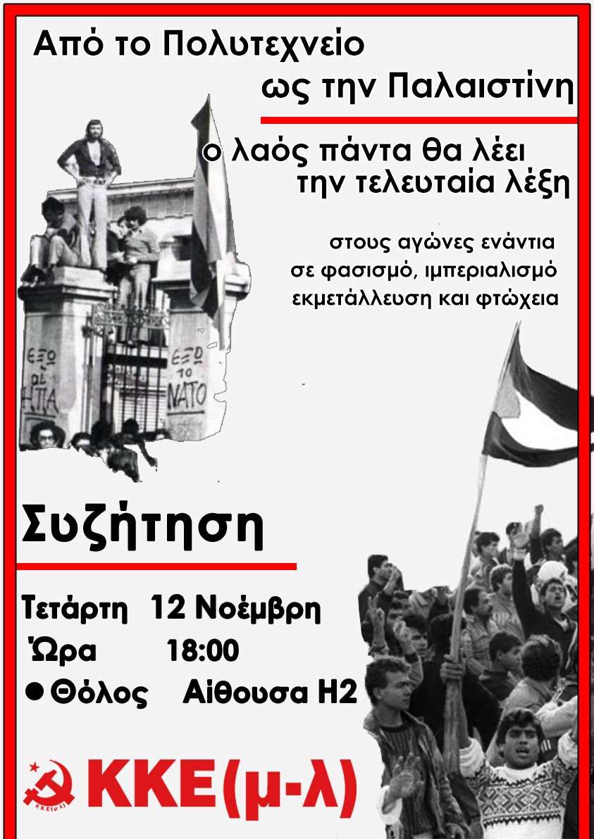 Εκδήλωση του ΚΚΕ(μ-λ) για την Παλαιστίνη το Σάββατο 15 Νοέμβρη στις 5:00 μμ στο Πολυτεχνείο (Πατησίων). Θα υπάρχει παρέμβαση από εκπρόσωπο της Ένωσης Παλαιστινιακών Κοινοτήτων και Οργανώσεων στην Ευρώπη.