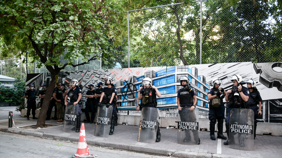 Σε εξέλιξη είναι οι εργασίες για τη δημιουργία Σταθμού Μετρό στην Πλατεία Εξαρχείων. Απαραίτητη «συνοδεία» στο εργοτάξιο, οι μόνιμες διμοιρίες των ΜΑΤ, οι ομάδες ΔΙΑΣ που περιπολούν τη γειτονιά και φυσικά η Αύρα ρίψης νερού και οι κλούβες όποτε χρειαστούν.