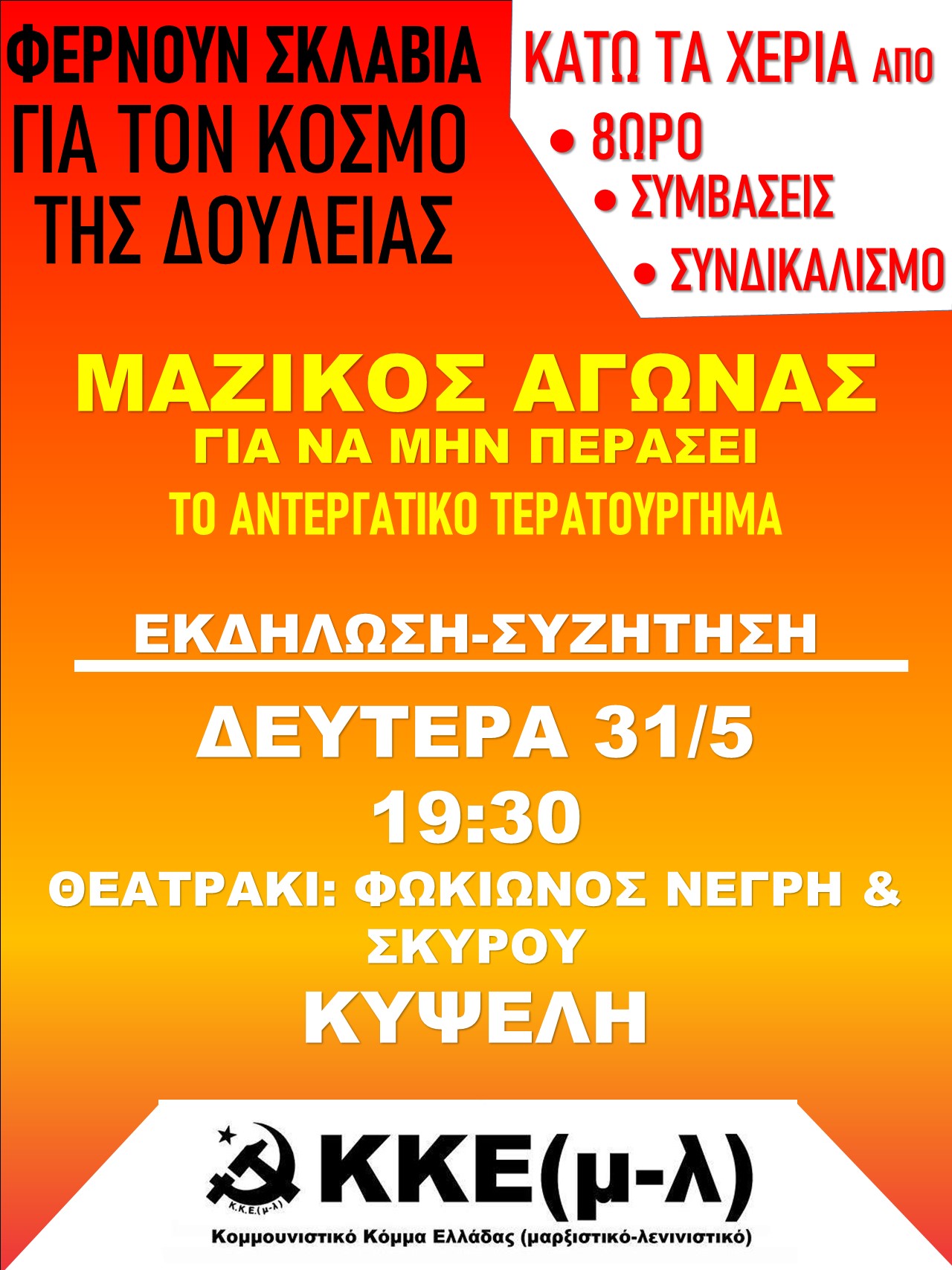 Αυτή τη φορά, οι φασίστες χτύπησαν το εκλογικό περίπτερο του ΚΚΕ(μ-λ) στη Κυψέλη, στην αρχή του πεζόδρομου της Φωκίωνος Νέγρη. Όπως πάντα μέσα στη νύχτα. Μακριά από τα βλέμματα των κατοίκων της περιοχής. Έσκισαν τις αφίσες που το “στόλιζαν”. Αυτές που καλούν το λαό “Για να ζήσει να αγωνιστεί”, “Στο δρόμο να νικήσει τους δυνάστες του”. Αυτές που προτρέπουν σε “Κοινή δράση και συντονισμό, ενάντια στην άγρια επίθεση που έρχεται”. Έχουν σοβαρό πρόβλημα οι πιο μαύρες ομάδες του συστήματος!