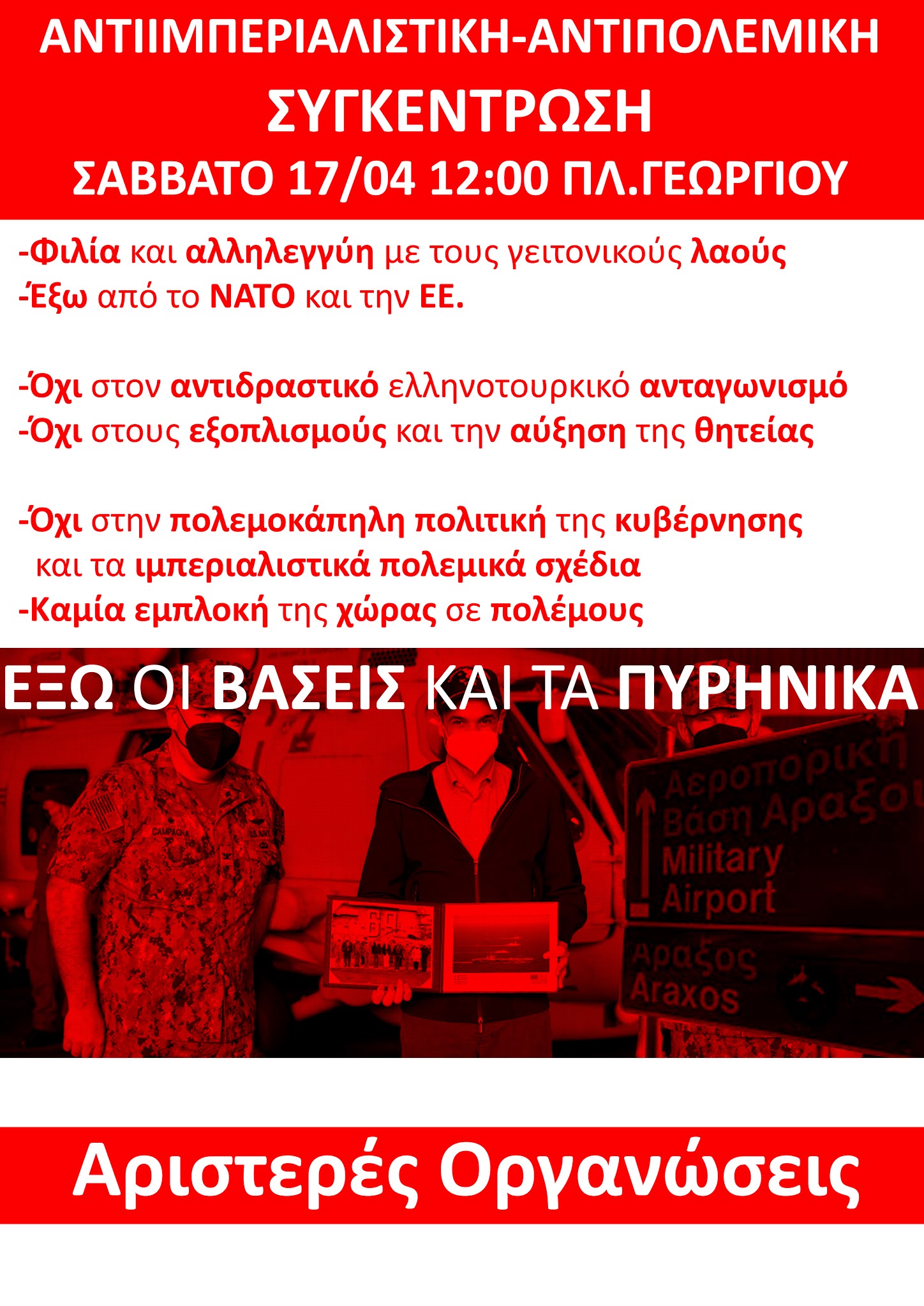 ΣΥΓΚΕΝΤΡΩΣΗ 17 ΑΠΡΙΛΗ 12:00 ΠΛΑΤΕΙΑ ΓΕΩΡΓΙΟΥ Η κυβέρνηση εντείνει την πολεμοκάπηλη πολιτική της σπρώχνοντας το λαό και την νεολαία στα επικίνδυνα σχέδια των ιμπεριαλιστικών επιδιώξεων, μετατρέποντας ολόκληρη την χώρα σε οπλοστάσιο και ορμητήριο των πολεμικών συγκρούσεων στην περιοχή.