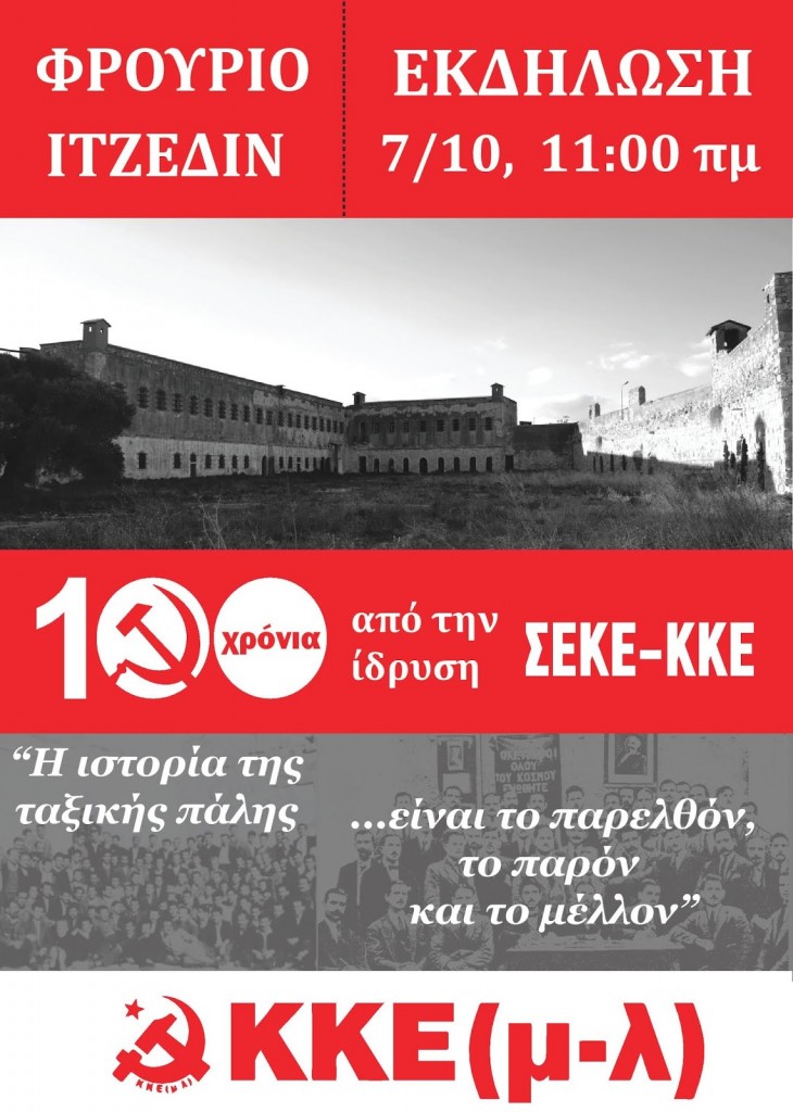 100 χρόνια από την ίδρυση του ΣΕΚΕ-ΚΚΕ Επιμένουμε στο δρόμο της επανάστασης και του σοσιαλισμού Πολιτική εκδήλωση 27 Οκτώβρη, Πανεπιστήμιο Πειραιά, 3:00 μ.μ. Προσυγκέντρωση Πλατεία Καραϊσκάκη, 1:00 μ.μ. και πορεία στους δρόμους του Πειραιά Επιμένοντας στην ανάγκη ανασυγκρότησης του λαϊκού, εργατικού, επαναστατικού, κομμουνιστικού κινήματος για την ανατροπή της ιμπεριαλιστικής βαρβαρότητας και της καπιταλιστικής επίθεσης… Επιμένοντας