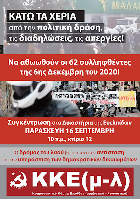 Να αθωωθούν οι διωκόμενοι αγωνιστές! Υπερασπιζόμαστε το δικαίωμα στον αγώνα και την οργανωμένη πολιτική δράση!