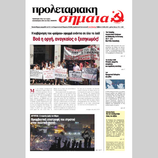 Διαβάστε όλο το φύλλο εδώ. Περιεχόμενα: Σελίδα 1 Η κυβέρνηση του «μαύρου» εφορμά ενάντια σε όλο το λαό! Βοά η οργή, αναγκαίος ο ξεσηκωμός! ΑΙΓΥΠΤΟΣ: Ο στρατός έριξε τον Μόρσι – Θριαμβευτική επιστροφή του στρατού στην πολιτική σκηνή   Σελίδα 2 (Πολιτική) Ο Κρόνος τρώει τα παιδιά του… (κρίση στην τρικομματική κυβέρνηση με αφορμή το