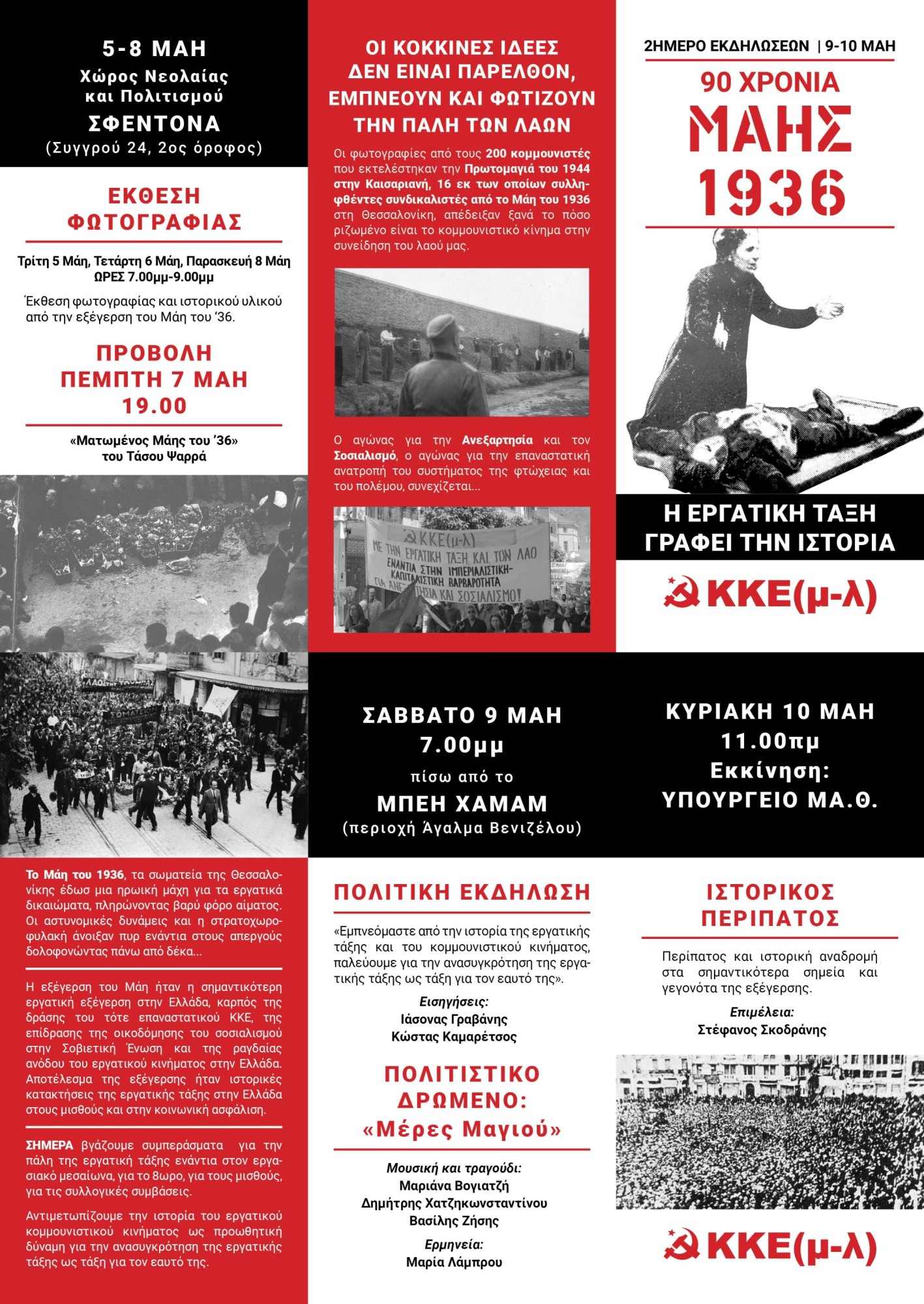 Το Μάη του 1936, τα σωματεία της Θεσσαλονίκης έδωσαν μια ηρωική μάχη για τα εργατικά δικαιώματα, πληρώνοντας βαρύ φόρο αίματος. Οι αστυνομικές δυνάμεις και η στρατοχωροφυλακή άνοιξαν πυρ ενάντια στους απεργούς δολοφονώντας πάνω από δέκα... ΣΗΜΕΡΑ βγάζουμε συμπεράσματα για την πάλη της εργατική τάξης ενάντια στον εργασιακό μεσαίωνα, για το 8ωρο, για τους μισθούς, για τις συλλογικές συμβάσεις. Αντιμετωπίζουμε την ιστορία του εργατικού κομμουνιστικού κινήματος ως προωθητική δύναμη για την ανασυγκρότηση της εργατικής τάξης ως τάξη για τον εαυτό της.