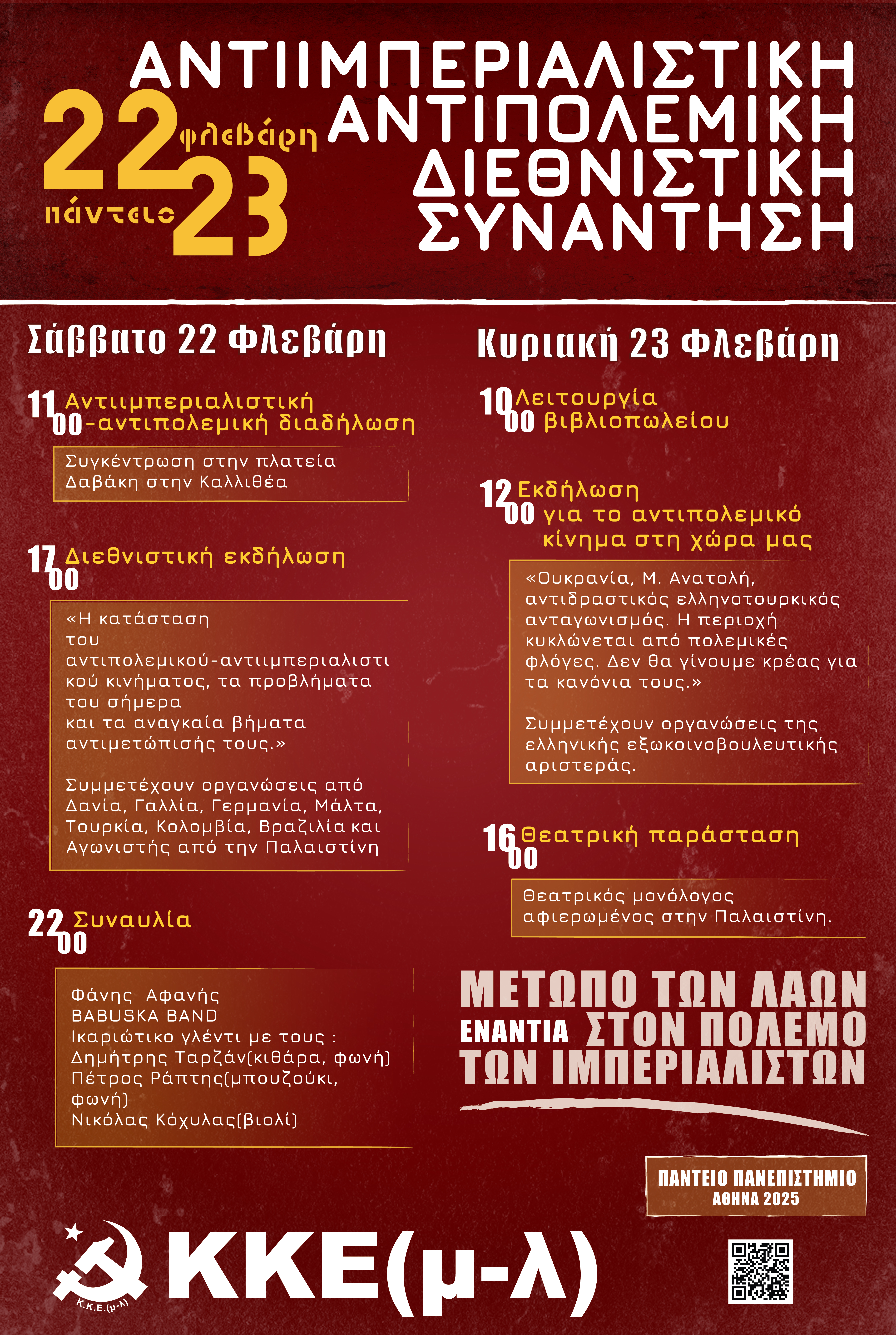 Μια πολύ σημαντική, πλούσια, μαζική και πολύπλευρη πολιτική διαδικασία, με κινηματικές και πολιτιστικές πλευρές, ήταν η Αντιιμπεριαλιστική Αντιπολεμική Διεθνιστική Συνάντηση, που πραγματοποιήθηκε το Σαββατοκύριακο 22 και 23 του Φλεβάρη στο Πάντειο Πανεπιστήμιο και στην Καλλιθέα