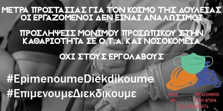 Στις υπηρεσίες καθαριότητας, τα μέσα ατομικής προστασίας εξακολουθούν να μη δίνονται όλα, αλλά και να μην είναι κατάλληλα ώστε να προστατευτούν οι εργαζόμενοι. Η εντατικοποίηση στη δουλειά αυξάνεται λόγω των μόνιμων ελλείψεων στο προσωπικό, που μειώνεται ακόμα πιο πολύ αυτές τις μέρες, ενώ λόγος για νέες προσλήψεις κανένας. Το μόνο που προτείνεται σαν λύση είναι να αναλάβουν ιδιωτικές εταιρείες την καθαριότητα, όπως προβλέπει και η σχετική ΠΝΠ. Όλες οι ΠΝΠ μέχρι σήμερα έχουν καταφέρει να δώσουν το ελεύθερο στις δημοτικές αρχές να πράττουν όπως θέλουν σε βάρος των εργαζομένων.