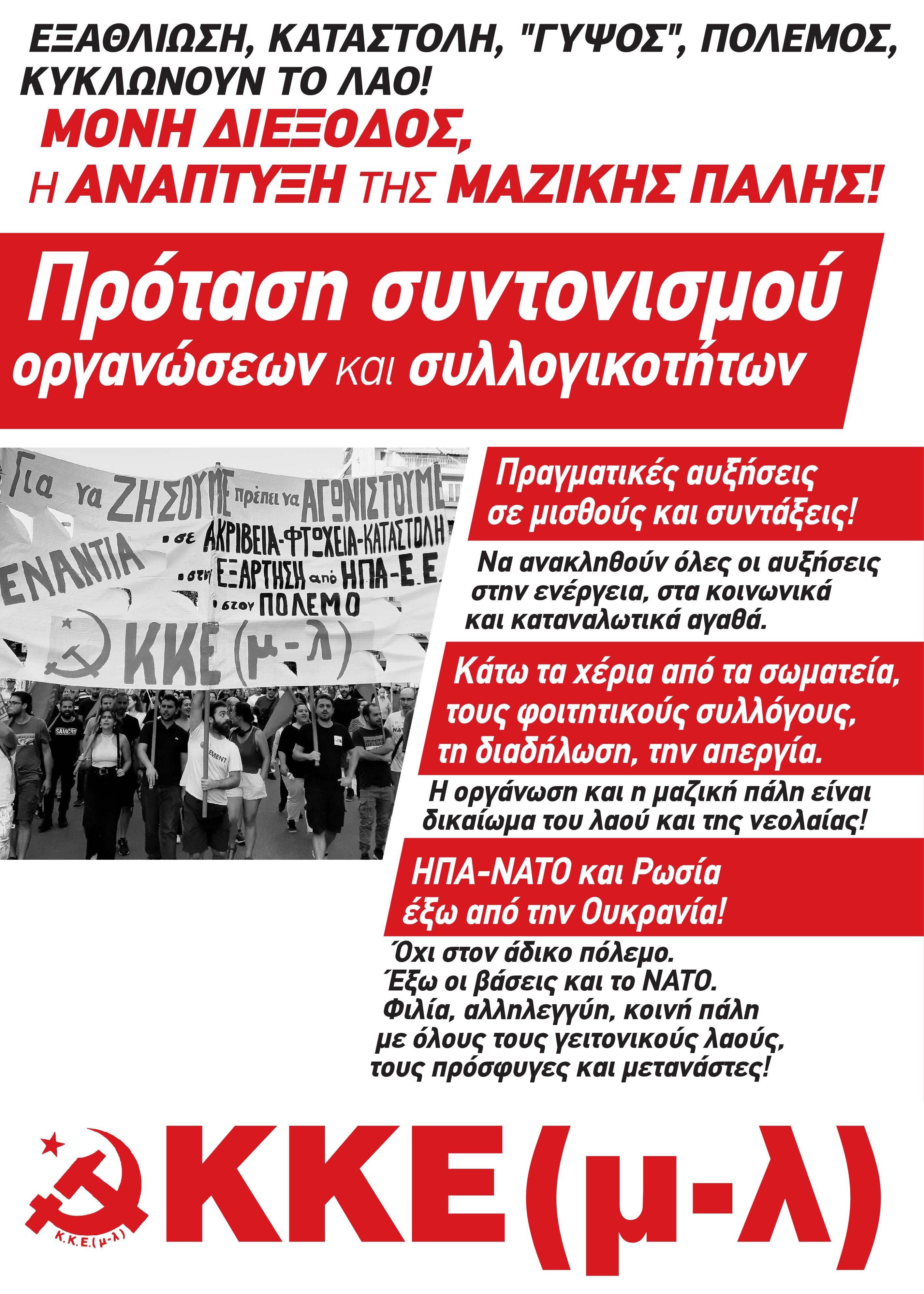 Η μόνη δύναμη που μπορεί να σταθεί απέναντι στην εξελισσόμενη βαρβαρότητα είναι αυτή που έχει συμφέρον να το κάνει. Αυτή δεν είναι άλλη από τη δύναμη της λαϊκής πάλης! Η πρόταση του ΚΚΕ(μ-λ) για τον «συντονισμό οργανώσεων και συλλογικοτήτων για την ανάπτυξη της μαζικής πάλης» αυτή την κατεύθυνση επιδιώκει να υπηρετήσει. Γι’ αυτό θεωρούμε ότι η πρόταση αυτή χρειάζεται να συζητηθεί συλλογικά και μαζικά, στο κίνημα, στους χώρους δουλειάς, νεολαίας και στις γειτονιές. Γιατί χρειάζεται να γίνουν βήματα στην κατεύθυνση της μόνης πραγματικής ελπίδας για τον λαό!