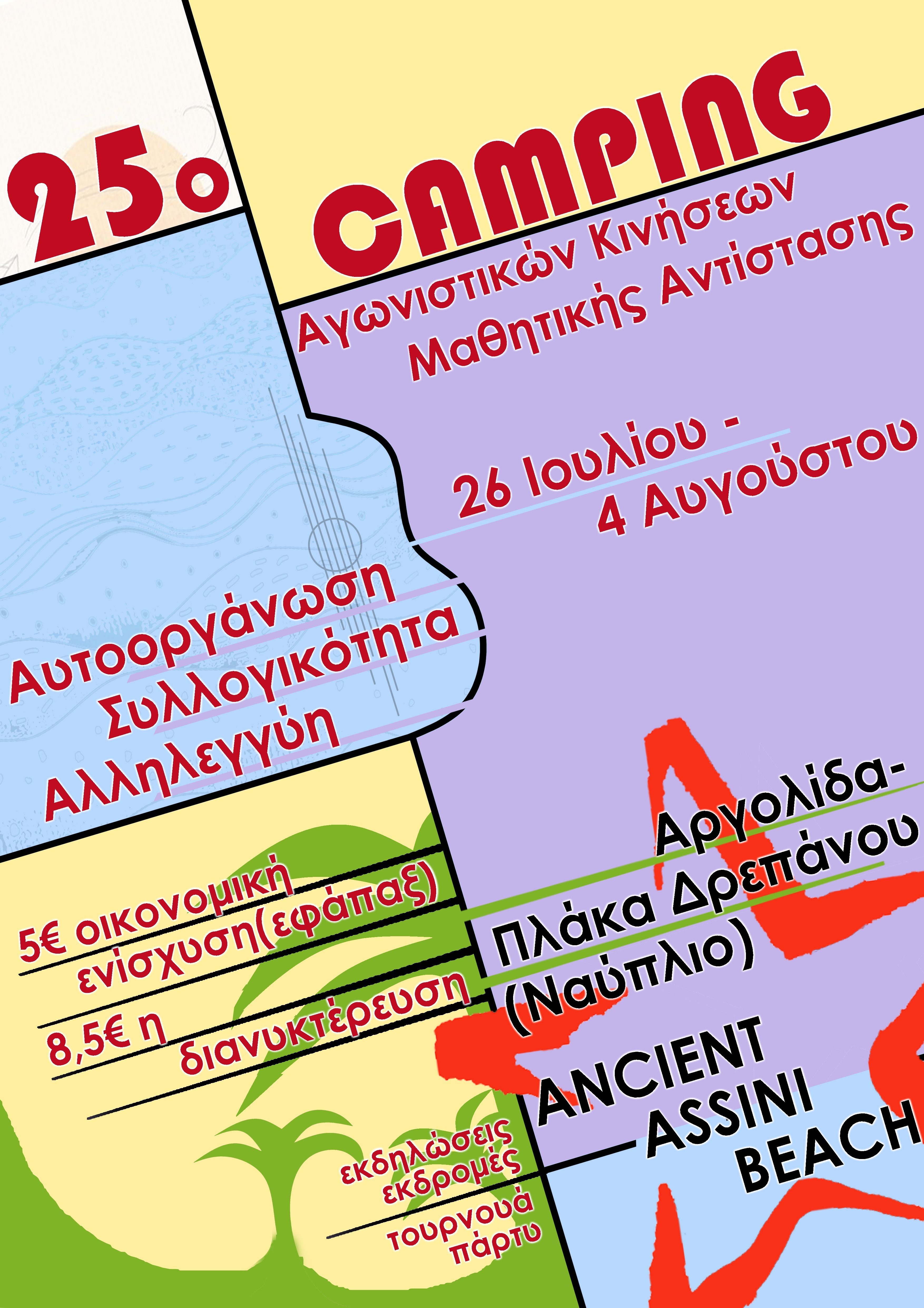 Σε αυτές τις δύσκολες συνθήκες και με αυτή τη λογική καλούμε τη νεολαία να αντιμετωπίσει και τις διακοπές της συλλογικά στο 25ο camping μας!