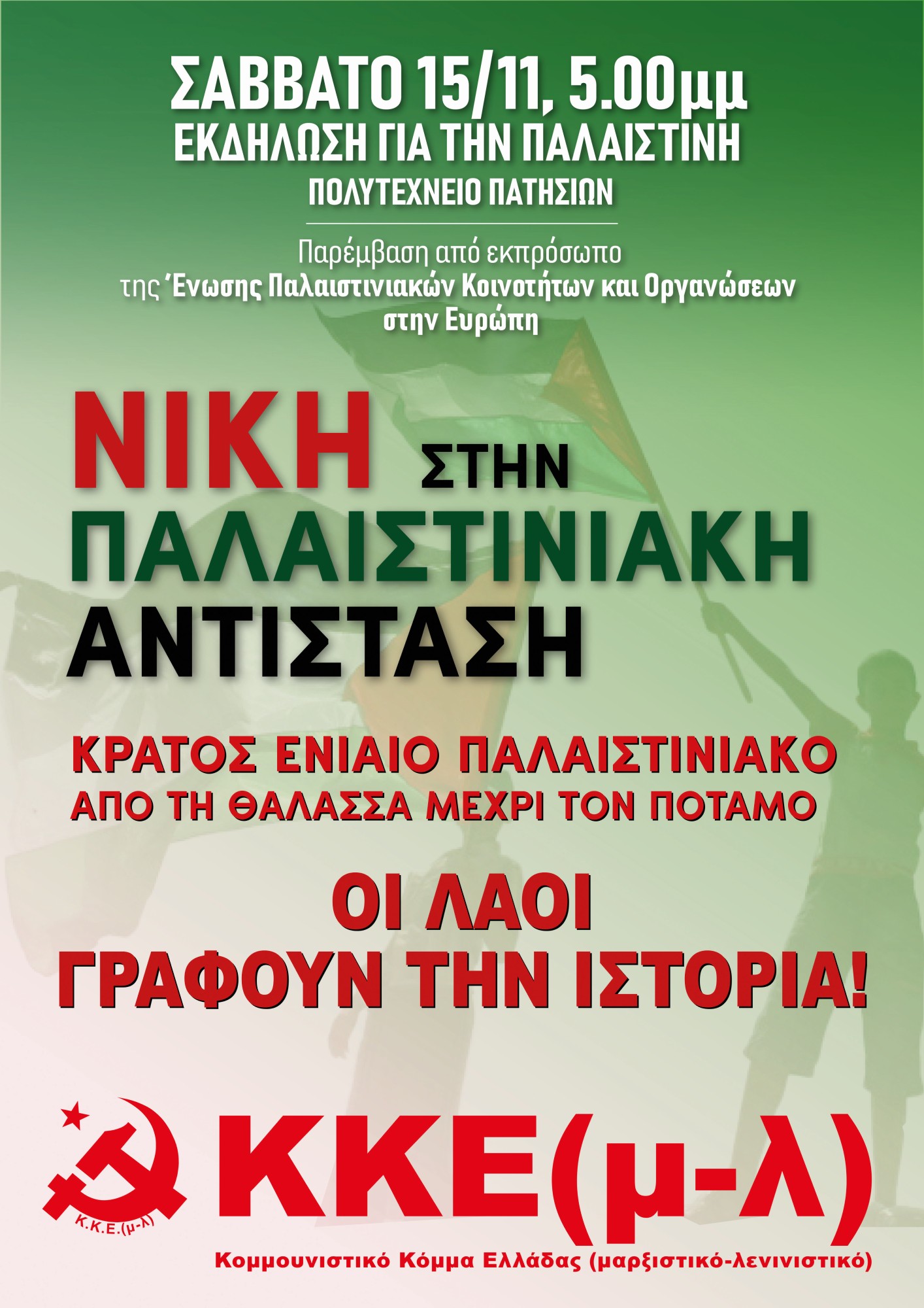 Εκδήλωση του ΚΚΕ(μ-λ) για την Παλαιστίνη το Σάββατο 15 Νοέμβρη στις 5:00 μμ στο Πολυτεχνείο (Πατησίων). Θα υπάρχει παρέμβαση από εκπρόσωπο της Ένωσης Παλαιστινιακών Κοινοτήτων και Οργανώσεων στην Ευρώπη.