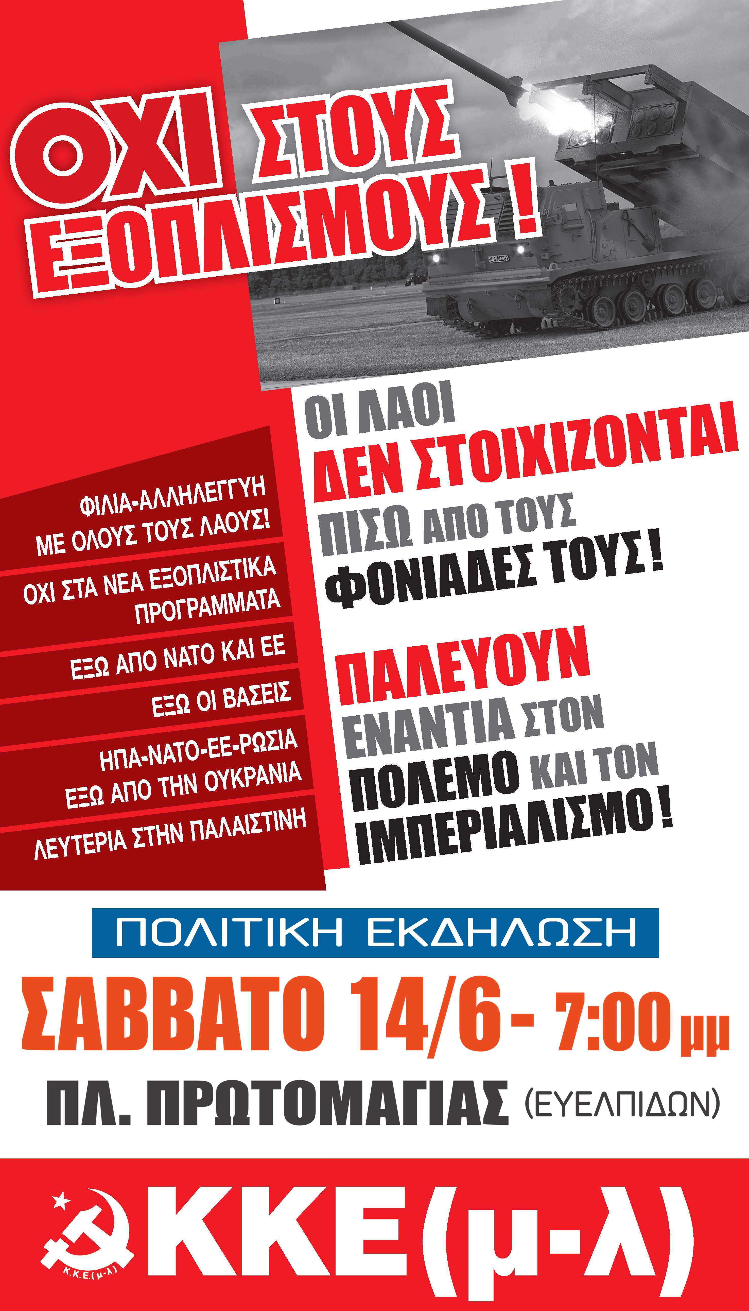 Το ΚΚΕ(μ-λ) καλεί σε συγκέντρωση διαμαρτυρίας σήμερα 9/6, στις 18:30 στο Μετρό Πανόρμου. Να απελευθερωθούν άμεσα όλοι οι απαχθέντες του πληρώματος του "Madleen", να σπάσει ο αποκλεισμός του σιωνιστικού κράτους τρομοκράτη του Ισραήλ.Λευτερια στην Παλαιστίνη από τη Μεσόγειο μέχρι τον Ιορδάνη.