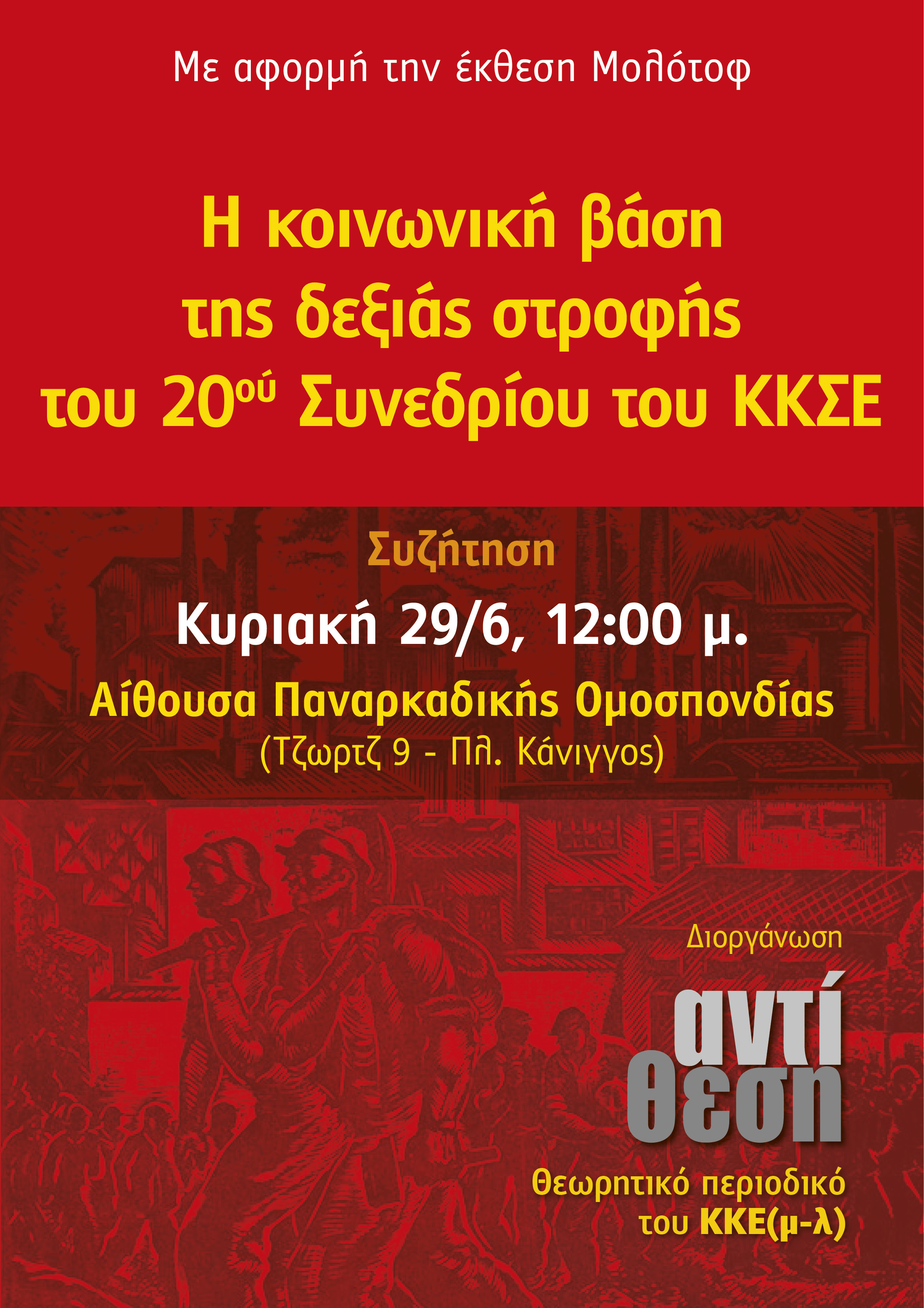 Το περιοδικό «Αντίθεση», θεωρητικό περιοδικό του ΚΚΕ(μ-λ), διοργανώνει συζήτηση με θέμα «Η κοινωνική βάση της δεξιάς στροφής του 20ού Συνεδρίου του ΚΚΣΕ», την Κυριακή 29/6, στις 12 το μεσημέρι στην αίθουσα της Παναρκαδικής Ομοσπονδίας (Τζωρτζ 9, Πλατεία Κάνιγγος).