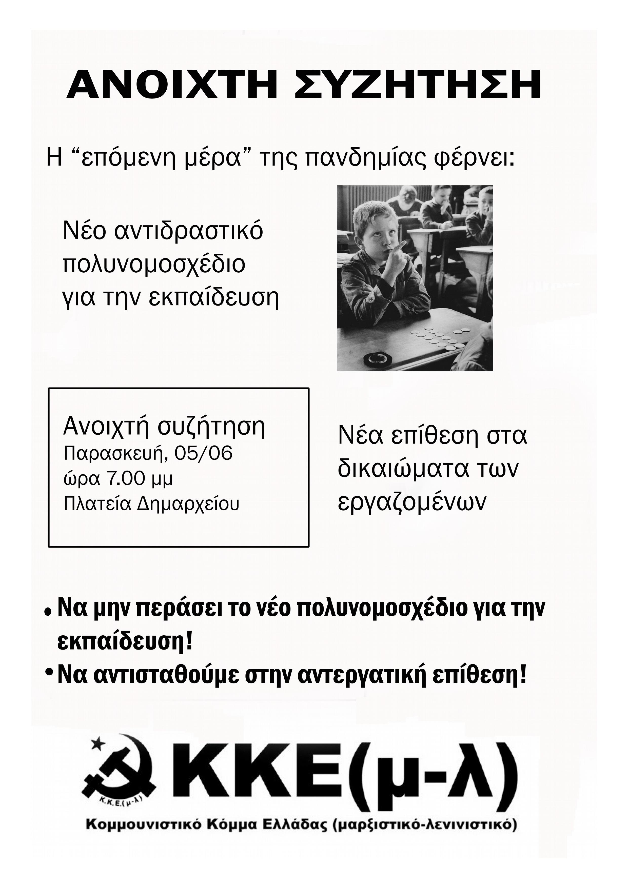 Η ανάγκη να ανοίξει η συζήτηση για τις ανάγκες μας, είναι πιο επιτακτική από ποτέ. Μετά το κλείσιμο στην καραντίνα, το να αντισταθούμε απέναντι σε όλα αυτά που μας ετοιμάζουν και που εξελίσσονται είναι ζήτημα επιβίωσης για το λαό. Να οργανώσουμε τις αντιστάσεις μας και να διεκδικήσουμε δικαιώματα στην παιδεία στην υγεία, στην εργασία, στη σύνταξη, στα δημοκρατικά δικαιώματα, μέσα απ’ τους αγώνες μας στη δουλειά , στη γειτονιά, στο σχολείο.