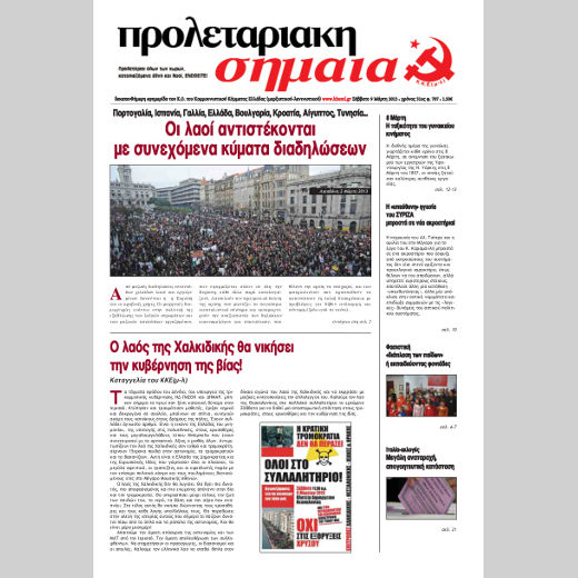 Διαβάστε όλο το φύλλο εδώ. Περιεχόμενα: Σελίδα 1 Πορτογαλία, Ισπανία, Γαλλία, Ελλάδα, Βουλγαρία, Κροατία, Αίγυπτος, Τυνησία… – Οι λαοί αντιστέκονται με συνεχόμενα κύματα διαδηλώσεων Ο λαός της Χαλκιδικής θα νικήσει την κυβέρνηση της βίας! – Καταγγελία του ΚΚΕ(μ-λ)   Σελίδα 2 (Πολιτική) Πορτογαλία, Ισπανία, Γαλλία, Ελλάδα, Βουλγαρία, Κροατία, Αίγυπτος, Τυνησία… – Οι λαοί αντιστέκονται με